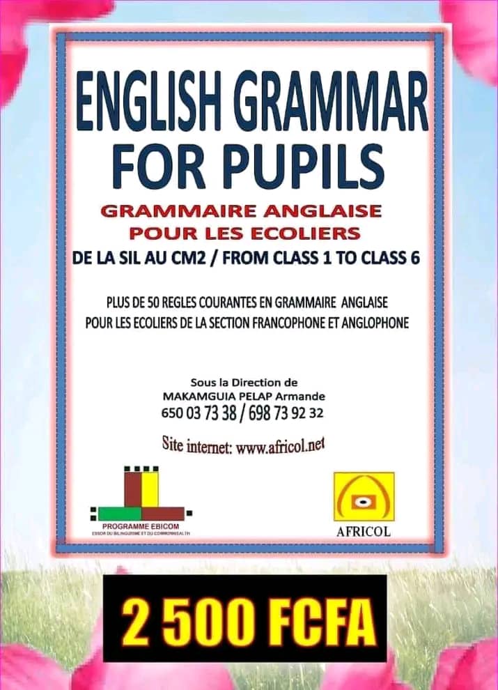 La grammaire anglaise est l'outil essentiel qui permet de bien s'exprimer en langue anglaise. En effet vous ne pouvez pas avoir une bonne expression orale et écrite en anglais si vous ne maîtrisez pas la grammaire anglaise. Le livre " *English grammar for pupils* " a été conçu spécialement pour aider les écoliers DE LA CLASS DE SIL au CM2 ; FROM CLASS ONE TO CLASS SIX ainsi que les apprenants de la langue anglaise ayant un niveau débutant en anglais à assimiler facilement les règles de la grammaire anglaise. Le livre contient d'une part plus de 50 règles courantes de la grammaire anglaise des écoliers de la section francophone et anglophone et toutes ces règles sont expliquées de manière plus explicite et plus détaillée y compris des exemples à l'appuie ceci pour une assimilation efficace et rapide par l'apprenant. D'autre part il contient plus d'une vingtaine de chapitres portant sur les mots spécialisés ce qui permet aux apprenants d'enrichir leur vocabulaire et réduire les hésitations lorsqu'il s'agit de trouver les mots appropriés pour s'exprimer sur une question. En plus de ça le livre contient plus d'une vingtaine d'exercices d'application sur la grammaire et les mots spécialisés avec lesquels les apprenants peuvent s'entraîner quotidiennement. Les leçons de la grammaire anglaise qui se trouvent dans ce livre portent particulièrement sur les mots spécialisés et les règles de la grammaire anglaise notamment en ce qui concerne l'utilisation des articles et des pronoms dans les phrases, comment conjuguer les différents temps verbaux en anglais ainsi que la maîtrise de leur fonction, l'utilisation des prépositions, des apostrophes, des conjonctions, des adjectifs et des adverbes dans les phrases, comment transformer une phrase du discours direct au discours indirect, comment transformer une phrase de la voix active à la voix passive, comment lire les nombres et les heures etc. Ce livre est destiné principalement aux apprenants de la langue anglaise qui sont d'expression anglaise et française étant donné que les cours et les exemples sont expliqués en anglais puis traduits en français.